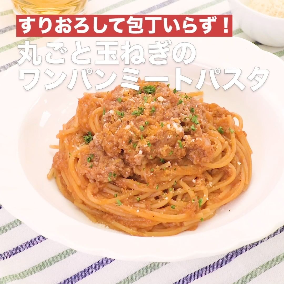 ⑧<すりおろして包丁いらず!丸ごと玉ねぎのワンパンミートパスタ>