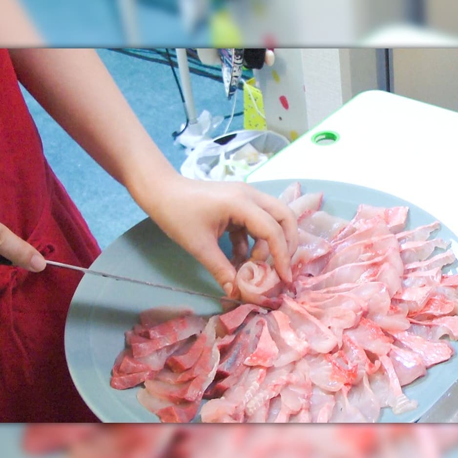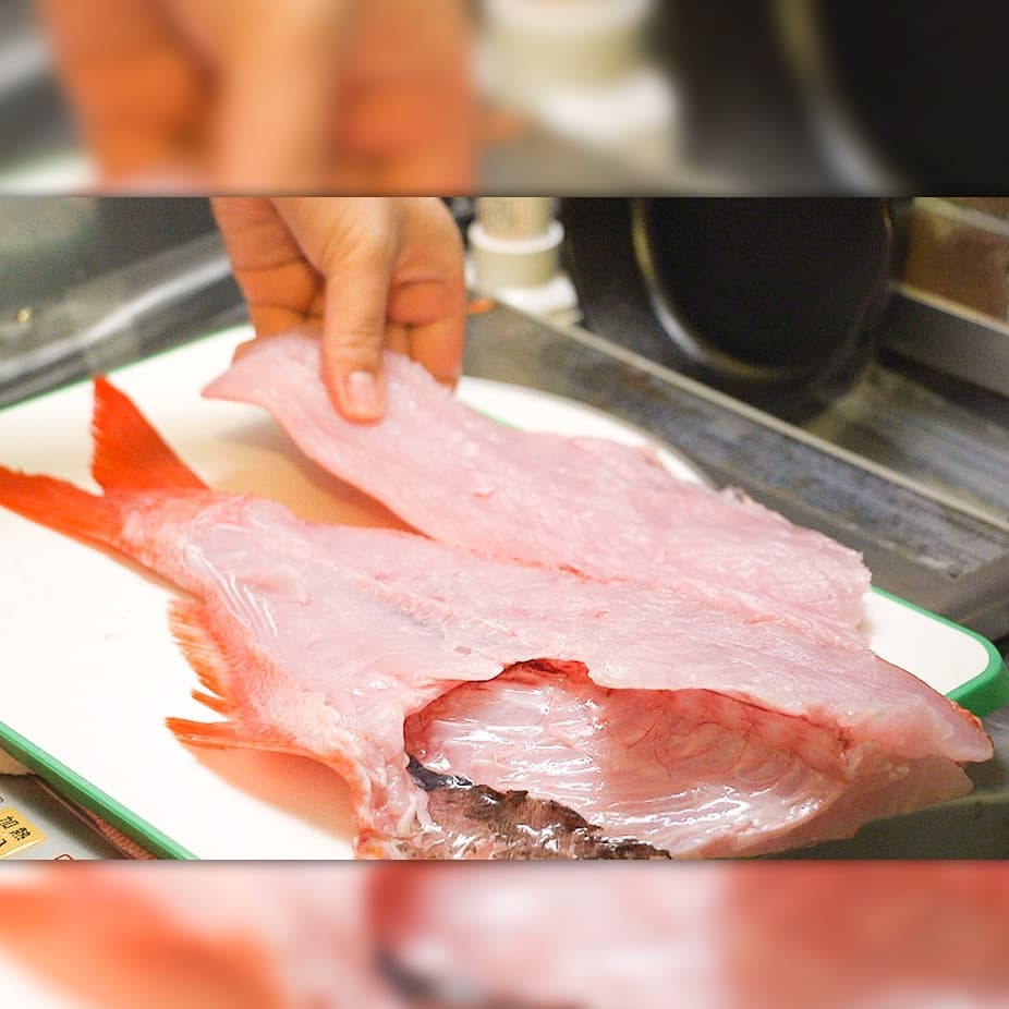 ①金目鯛1尾をさばき3枚におろしお刺身にする