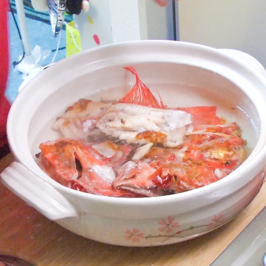 ② 金目鯛の頭と骨をきれいに洗いフライパンで焼き目がつくまで焼く