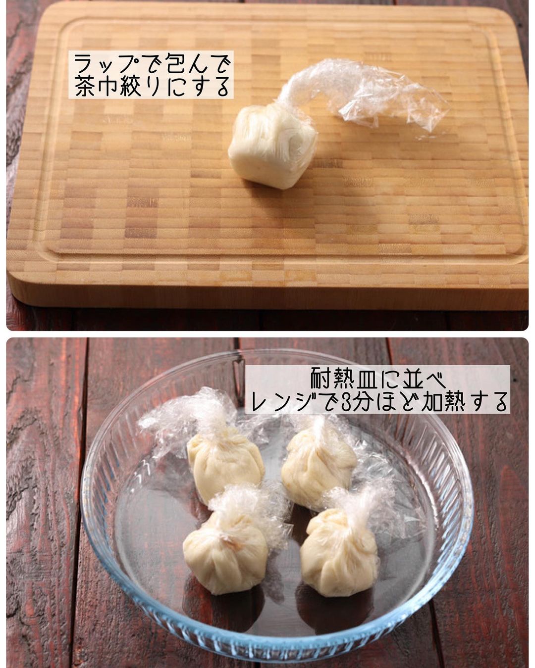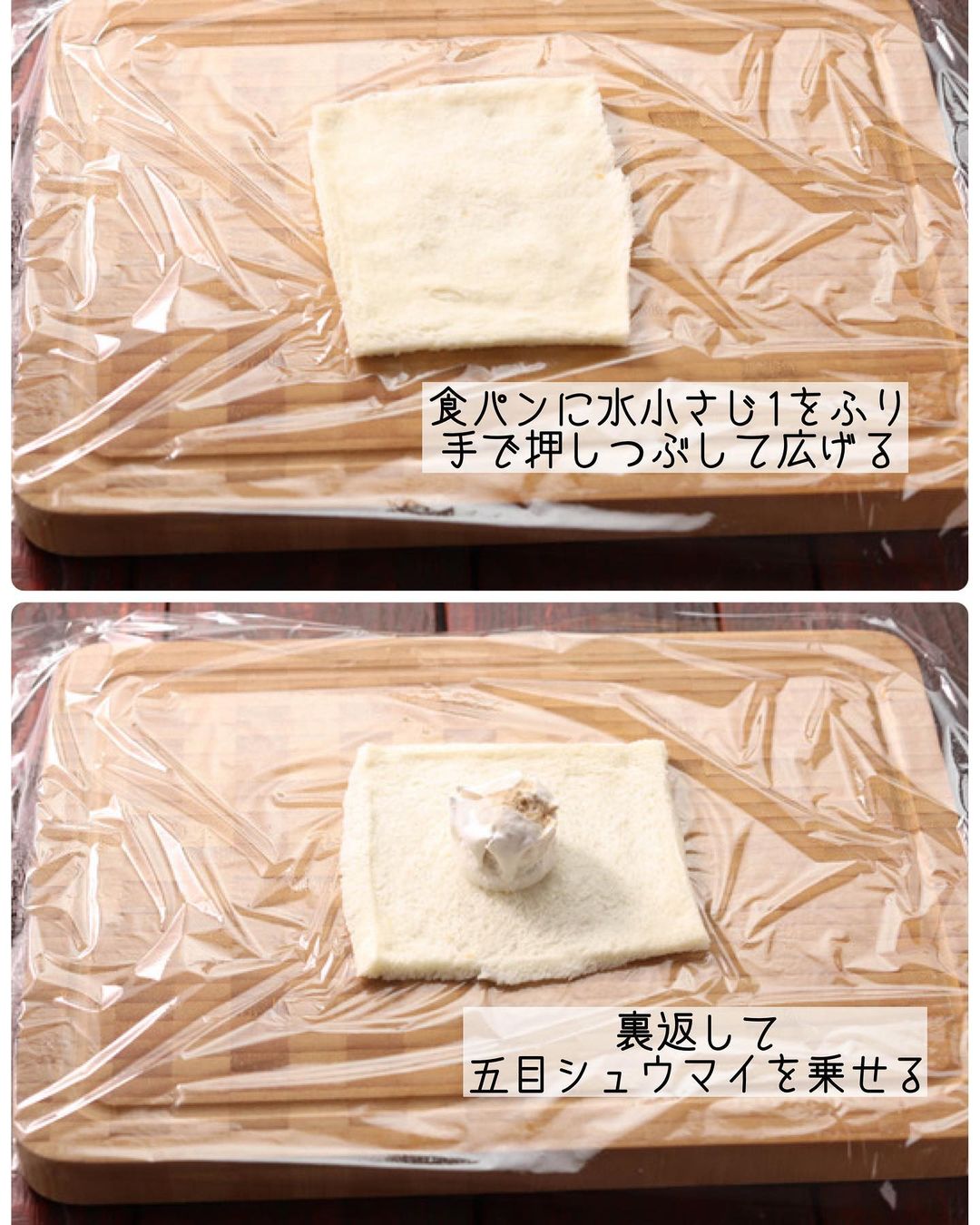 ➊ラップを広げ、上にサンドイッチ用食パンを乗せる。水小さじ1(分量外)を回しかけ、手でギュッと押し潰して広げる。裏返して真ん中に五目シュウマイを1個乗せ、ラップで包んで茶巾絞りにする。残り3個も同様に作る。