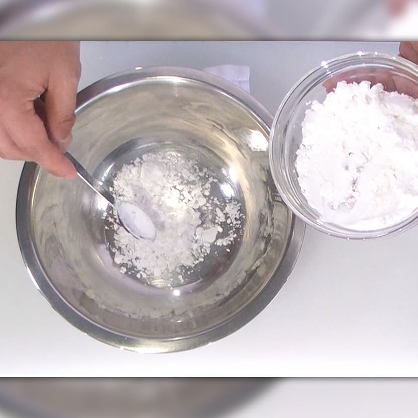 ①ボウルに片栗粉大さじ2、熱湯100mlを少しずつ加えながらよく混ぜる