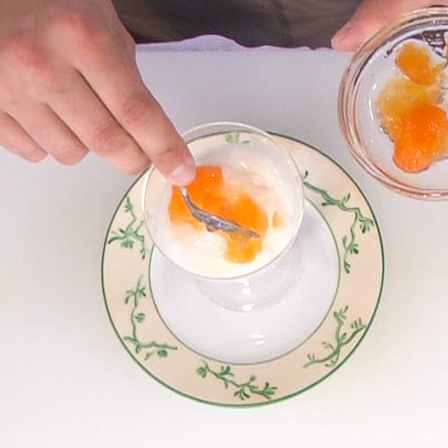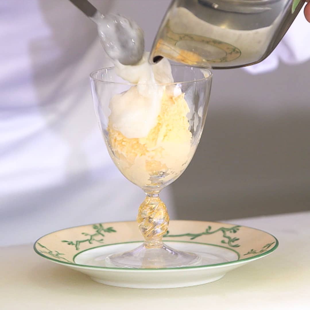 ③100円アイスを盛り付け、その上に冷ました②をのせる