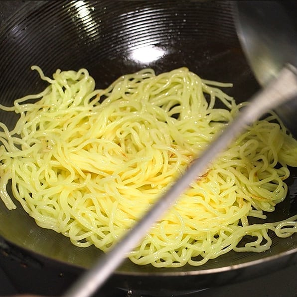 ②フライパンにサラダ油をひき、麺を炒め、一度麺を皿に逃がす