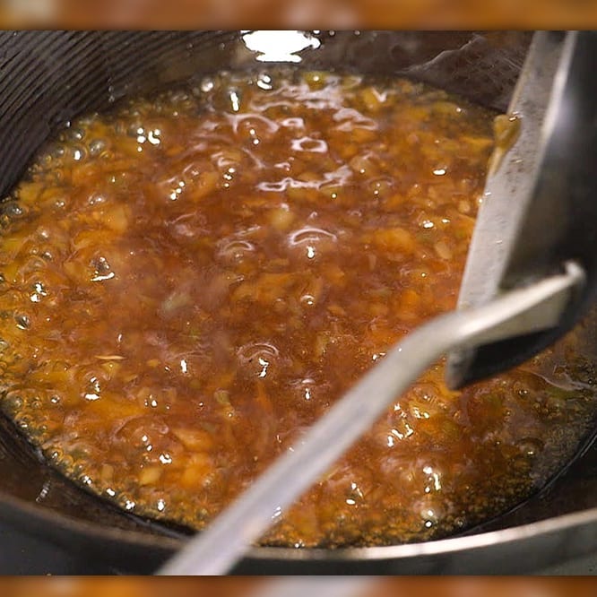 ③フライパンにザーサイだれ大さじ3、水80ml、水溶き片栗粉小さじ2(水:片栗粉=2:1)を入れ餡をつくる