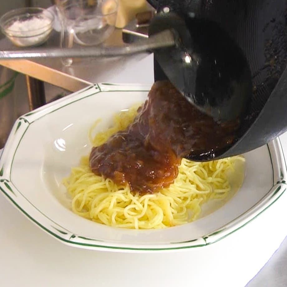 ④麺の上に餡をかけ、糸唐辛子を適量のせれば完成!
