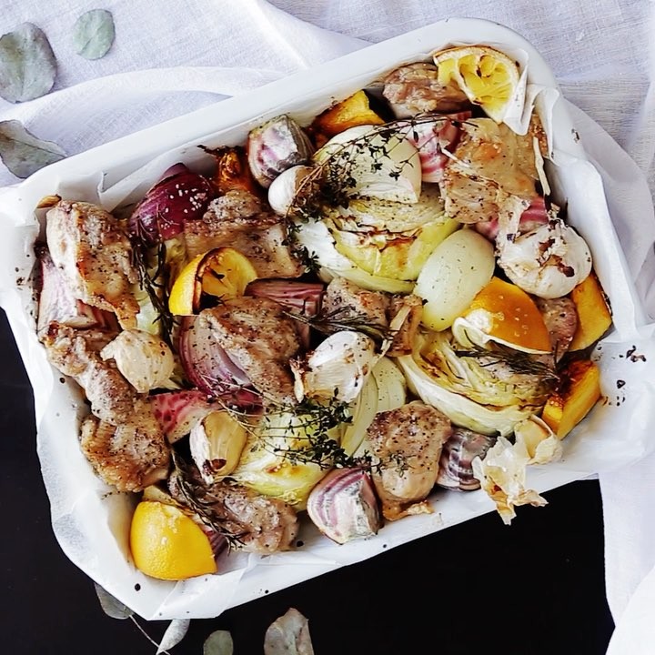 2. 天板にキャベツ、かぼちゃ、ビーツ、玉ねぎ、鶏もも肉を順に敷き詰める。上から塩・胡椒を振ったら、レモンを絞ってそのままのせる。さらに、にんにくとハーブをのせる。