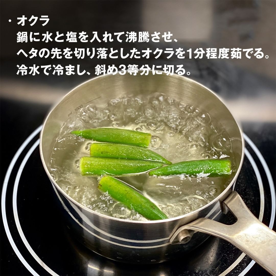 鍋に水と塩(水に対し1%)を入れて沸騰させ、ヘタの先を切り落としたオクラを1分程度茹でる。冷水で冷まし、斜め3等分に切る。