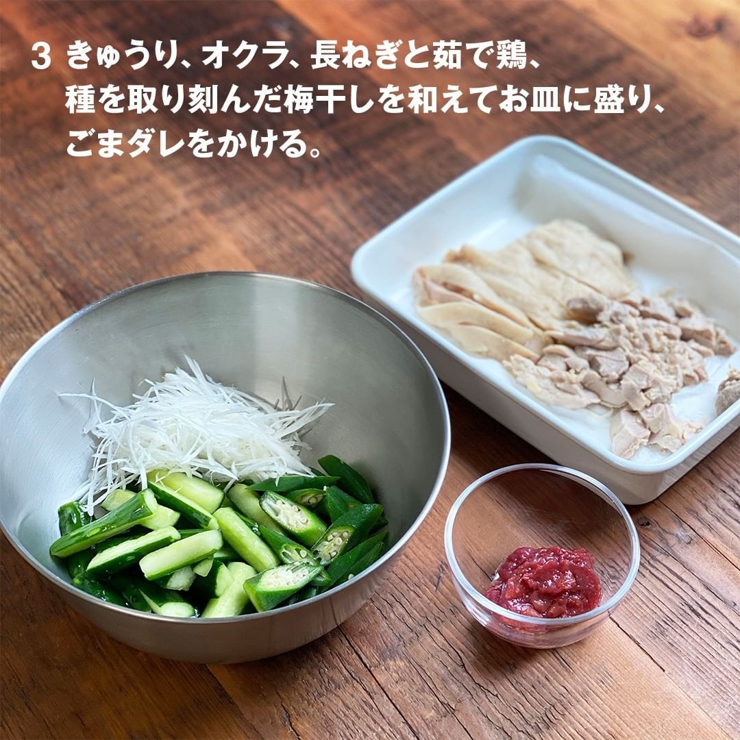 3.きゅうり、オクラ、長ねぎと茹で鶏、種を取り刻んだ梅干しを和えてお皿に盛り、材料を混ぜ合わせたごまダレをかける。