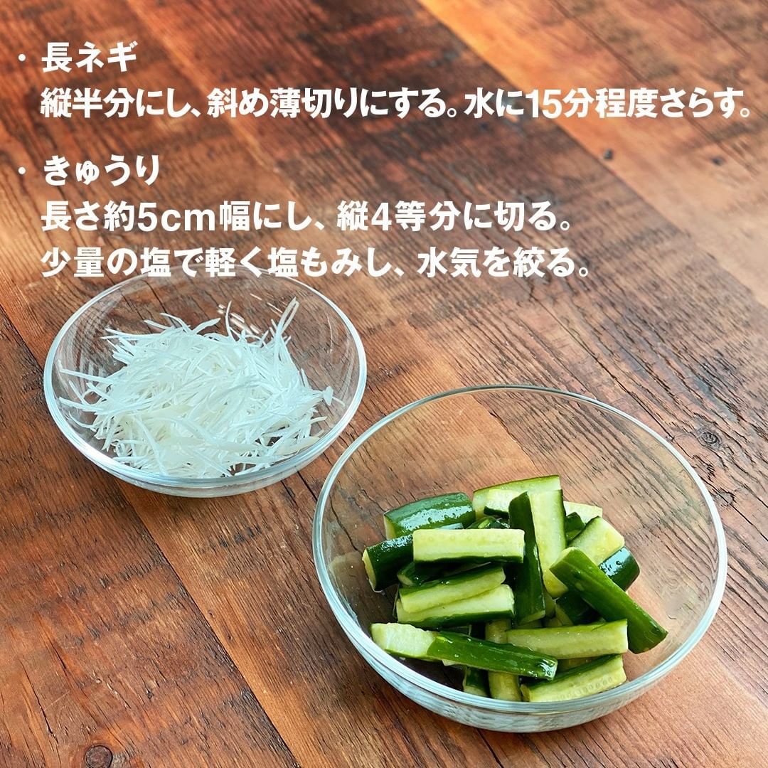 2.茹でた中華麺を入れ、茹で鶏、きゅうりと長ねぎの千切りをトッピングし、ラー油を回しかける。