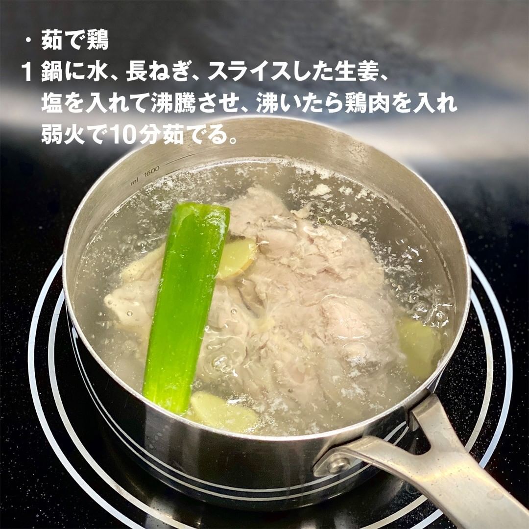 1.鍋に水、長ねぎ(青い部分)、スライスした生姜、塩を入れて沸騰させ、沸いたら鶏肉を入れ弱火で10分茹でる。