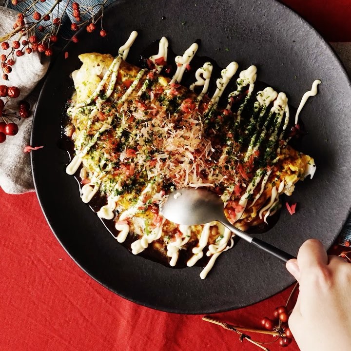 6.皿にのせたら、ソース、マヨネーズ、鰹節、紅生姜、青のりで飾り付けて完成!