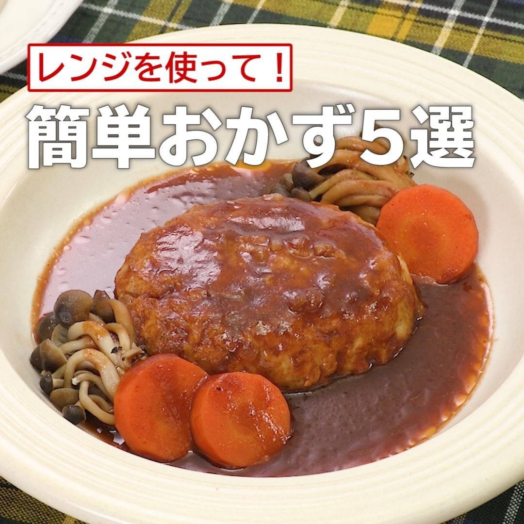 (4)3にソースをかけ、空いているところににんじん、しめじをおき、ふんわりとラップをして600Wのレンジで3分加熱する。