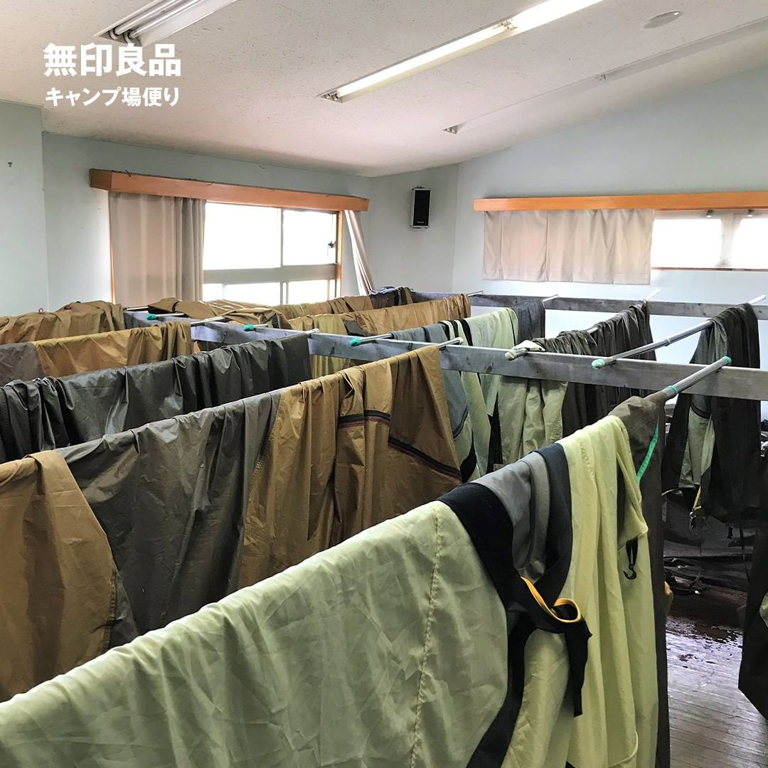 しかし、雨の日の作業はちょっと大変です。テントやタープはセンターハウスの2階へと運び、ストーブと扇風機を設置して室内干しに。