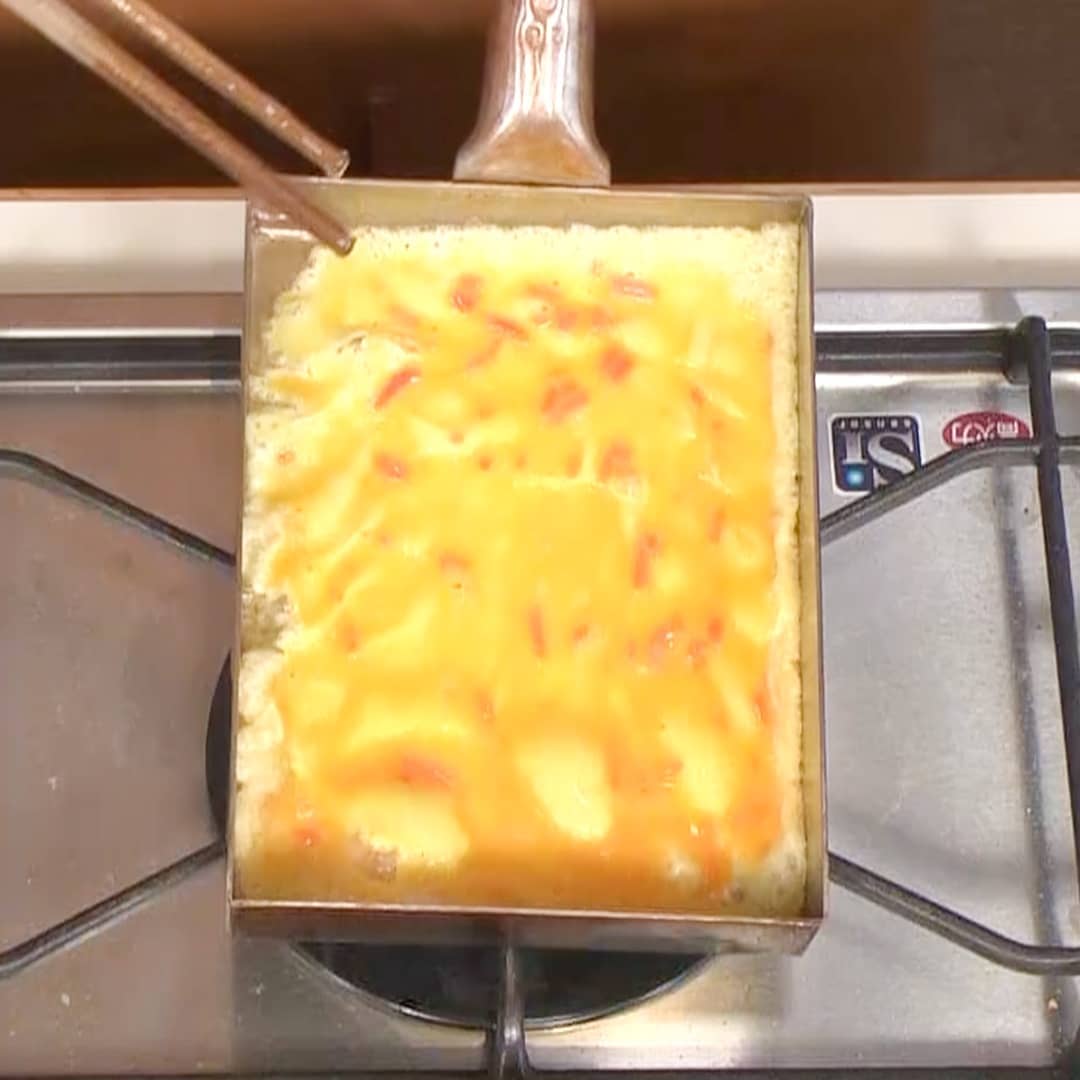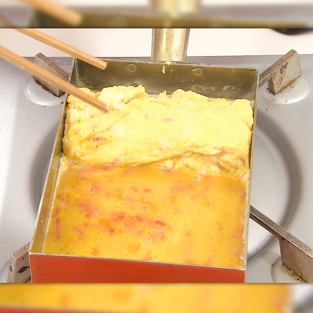 ⑤フライパンに③の1/4量を流し込み、半熟状になったら奥から手前に巻いて奥に移動します