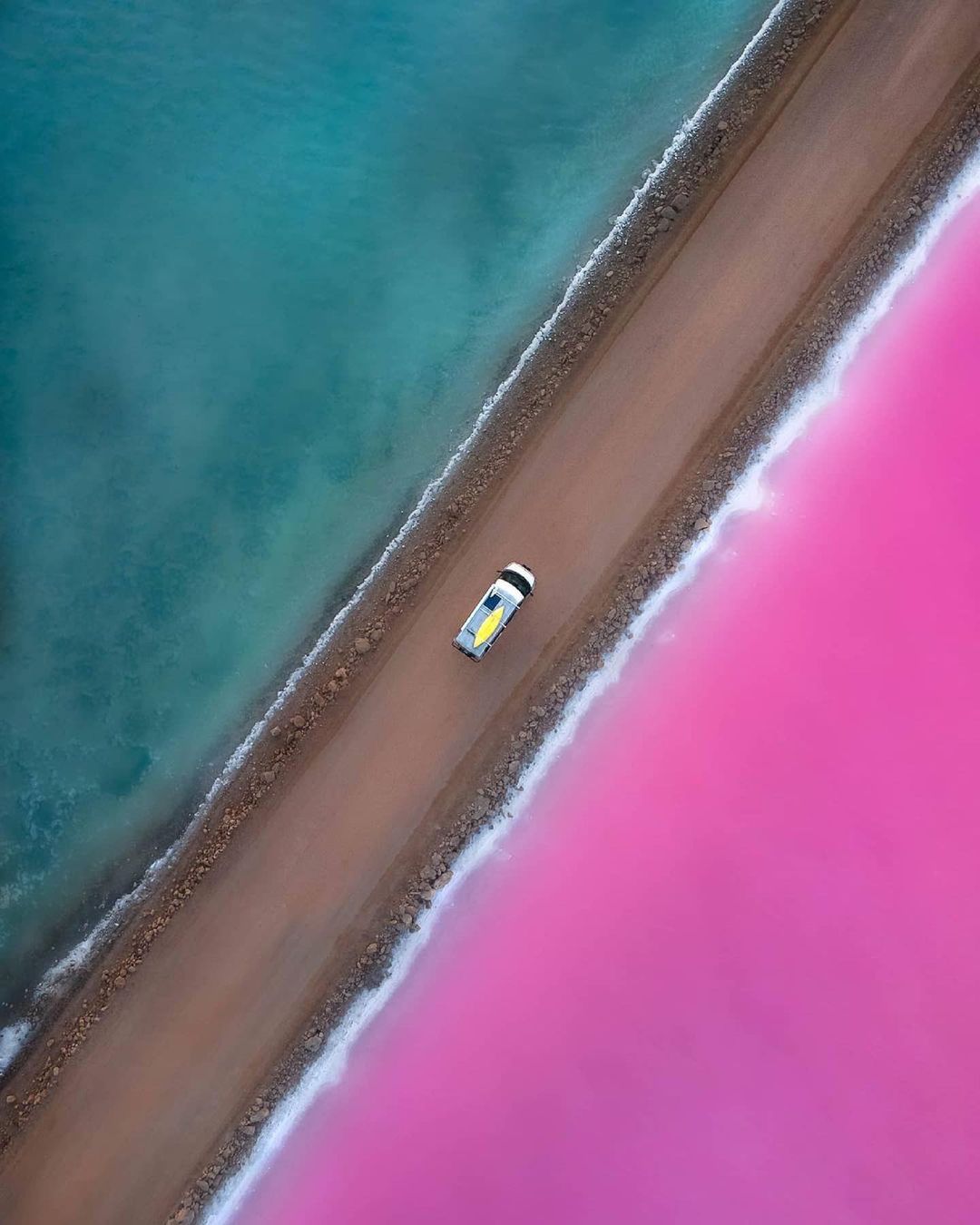 Watermelon avenue as it is aptly named due to the bold colours on either side of the gunbarrel-straight dirt road. One side is striking pink due to the high salt concentration and the other side is a beautiful blue-green lake. Lake MacDonell in South Australia is a far away drive from any town or city but is worth it for the epic drone photography. The shot was taken with the Sandmarc ND8/PL filter. The polariser cut down the glare and really makes the colours pop. 🍉🍉🍉