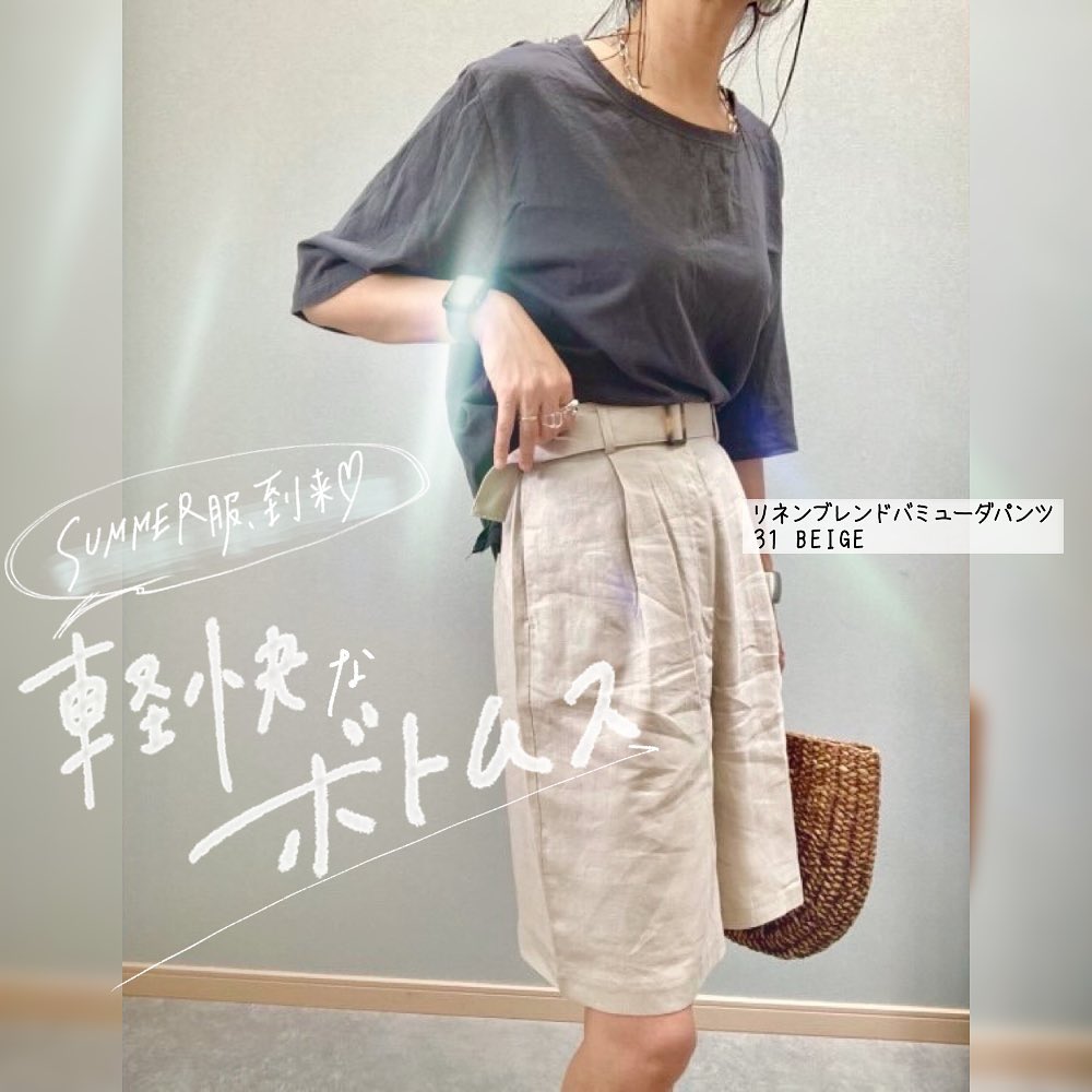 SUMMER服到来🌴🌈軽快なボトムスに、大注目😉 💕 膝上くらいの丈感が、トレンドな着こなしを叶えてくれますね✨リネンブレンドの素材が、軽くて、高見え😘夏のお洒落を、格上げしてくれますよ❤️ウエストマークできるベルトも、ポイント高めです👏今年は、バミューダパンツが良いかも👍是非、チェックしてみてくださいね😊