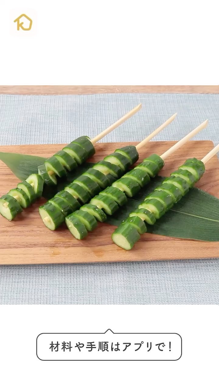 1. きゅうりは半分の長さに切り、割り箸を刺し、回しながららせん状に切り込みを入れ割り箸に沿って広げます。