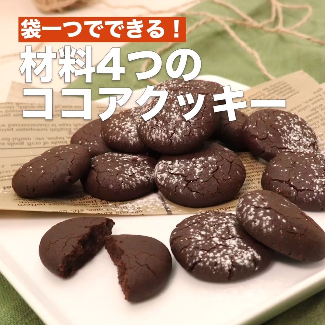 材料はたった4つだけ!袋1つでできるココアクッキーの紹介です。面倒な片付けも少なく、あっという間にできるので初心者でも大丈夫♪ホロホロ、サクサクの食感に仕上がります。子供と一緒に作ってみてはいかがでしょうか。