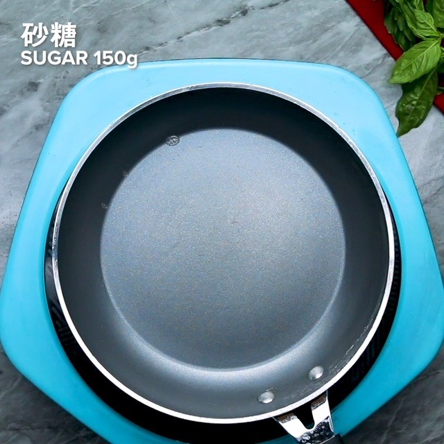 1. フライパンに砂糖、バジル、水を入れ、中火で熱す。2-3分沸騰させ、火から下ろす。