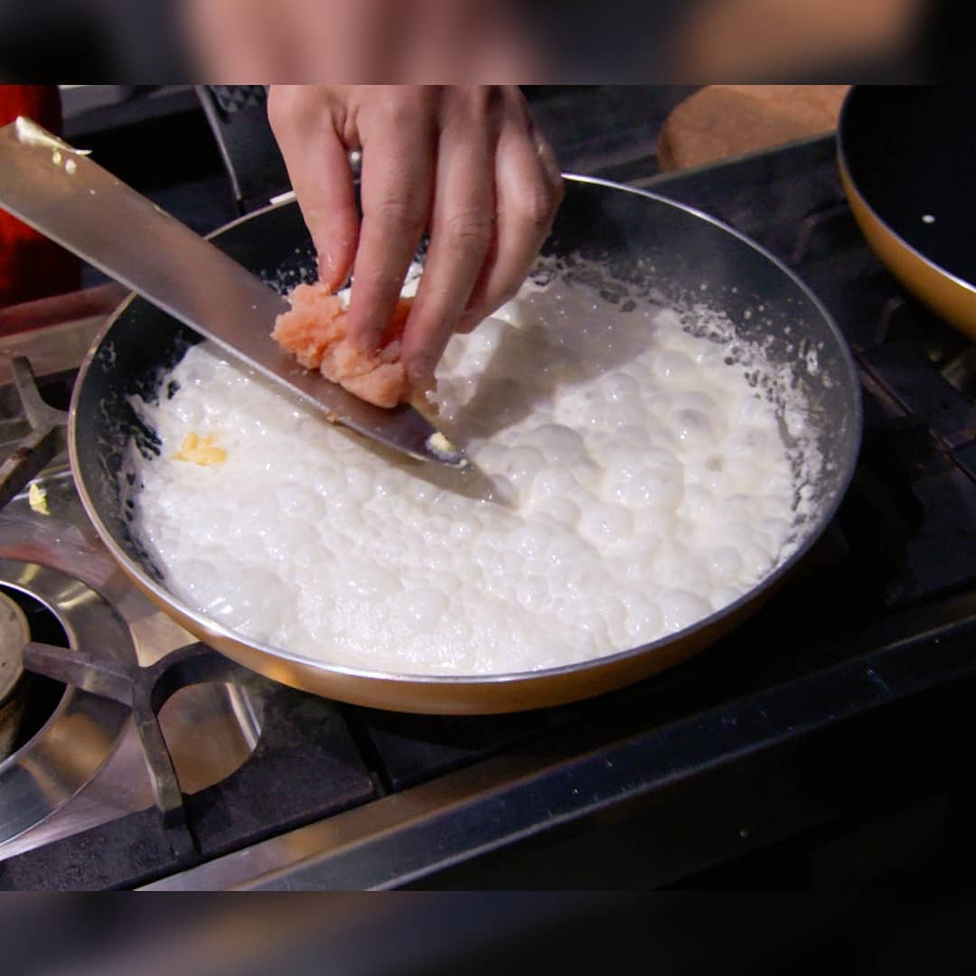 ①温めたフライパンに動物性の生クリーム(100ml)イカの塩辛(大さじ1弱)を入れ、軽く混ぜ合わせ煮詰める。