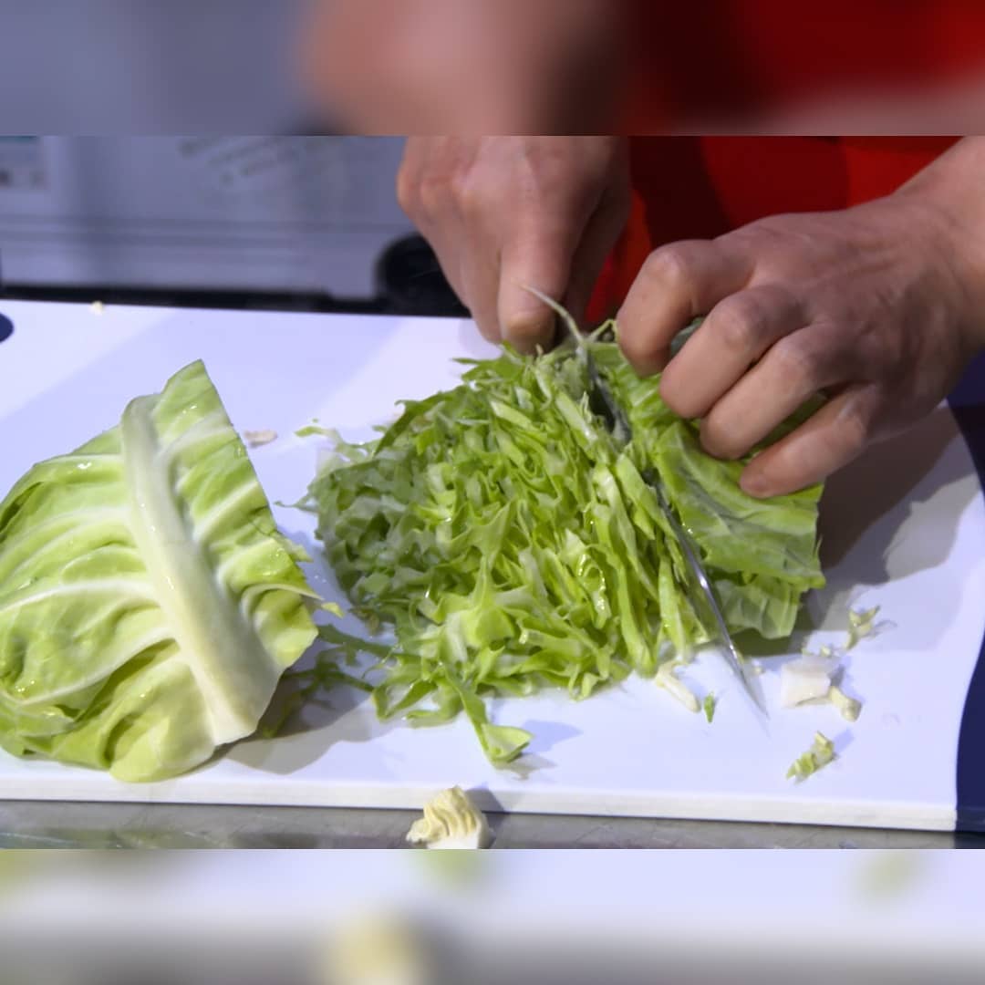 ②キャベツ(1/4)をせん切りし水分を切り、耐熱容器に移したら電子レンジ(500w)で1分10秒温める