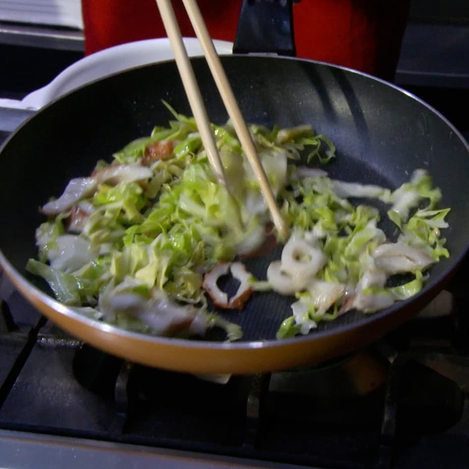 ③ボウルに千切りしたキャベツ(1/4弱)とろけるチーズ(大さじ1強)紅生姜(少々)輪切りにしたちくわ(1本)を入れ軽く混ぜたら、フライパンにサラダ油をひき炒める。
