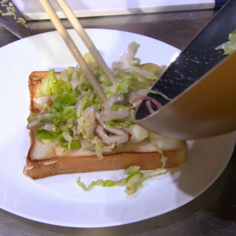 ⑤お皿にマヨネーズで焼いた食パン、その上に炒めたお好みキャベツ、ポーチドエッグをのせる。