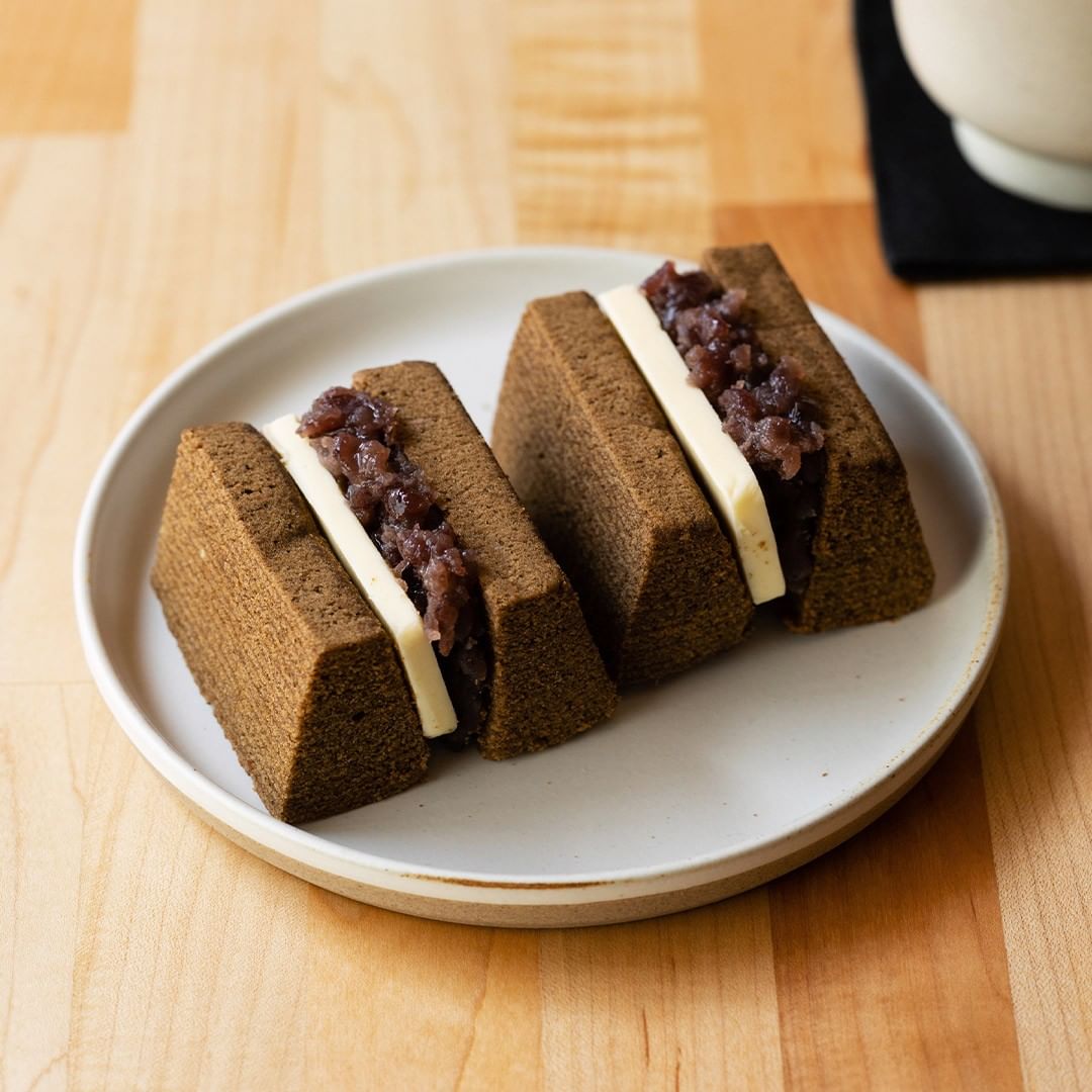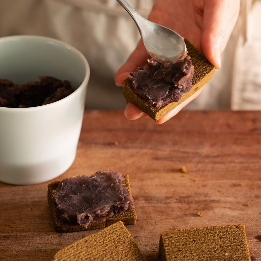 2.4等分にした「不揃い ほうじ茶バウム」に粒あんを塗り、バターを挟めばできあがりです。