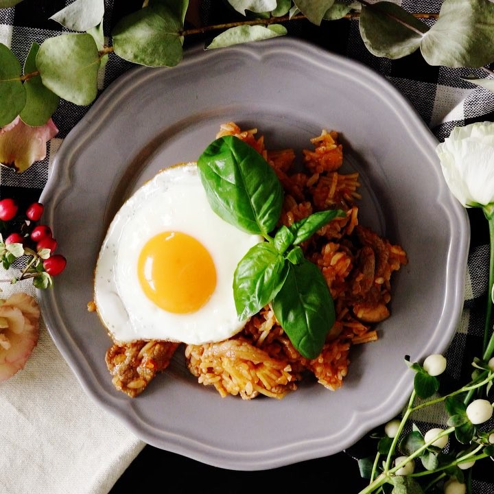 6. スパ飯の上に目玉焼きとバジルを乗せたら完成!