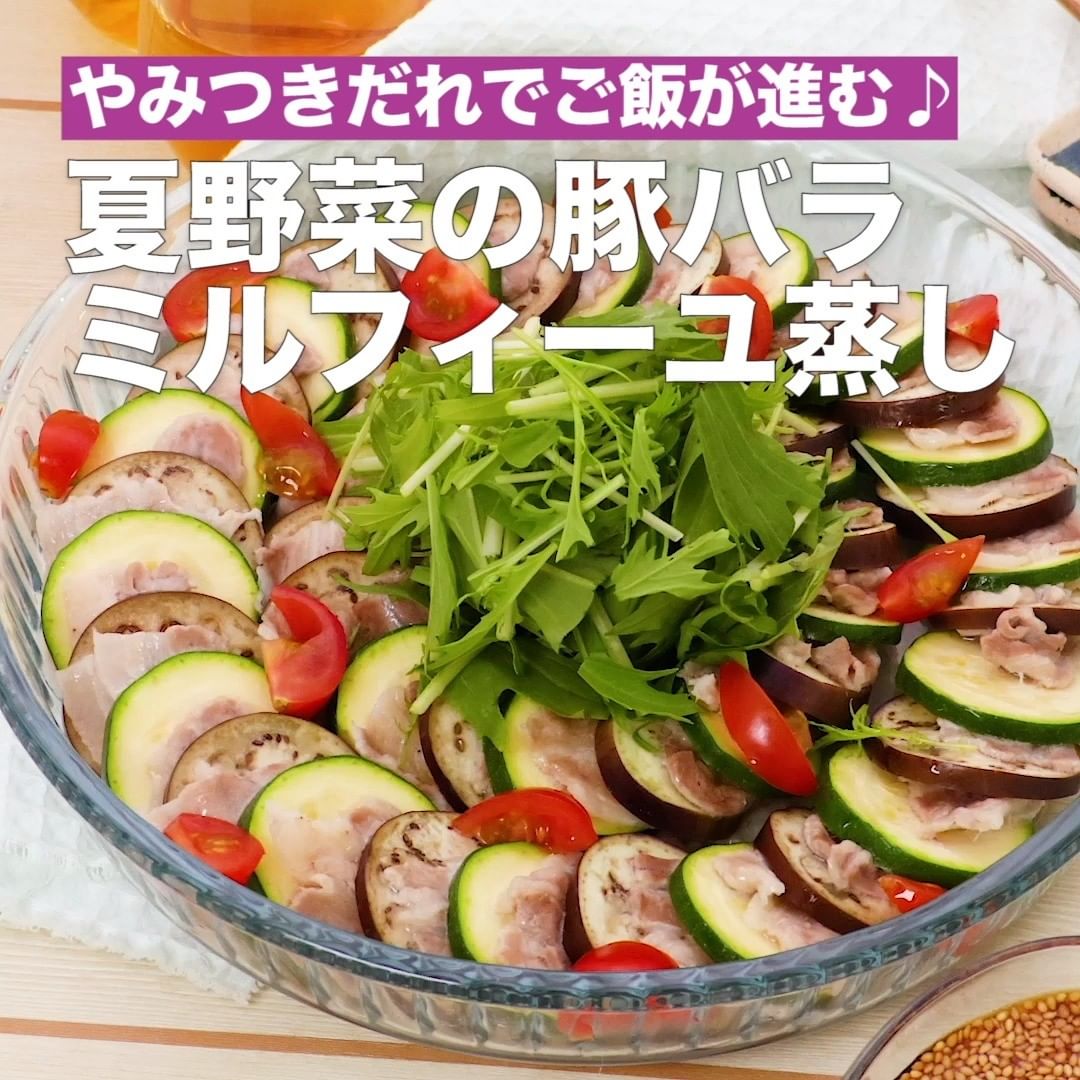 ①<やみつきだれでご飯が進む♪夏野菜の豚バラミルフィーユ蒸し>
