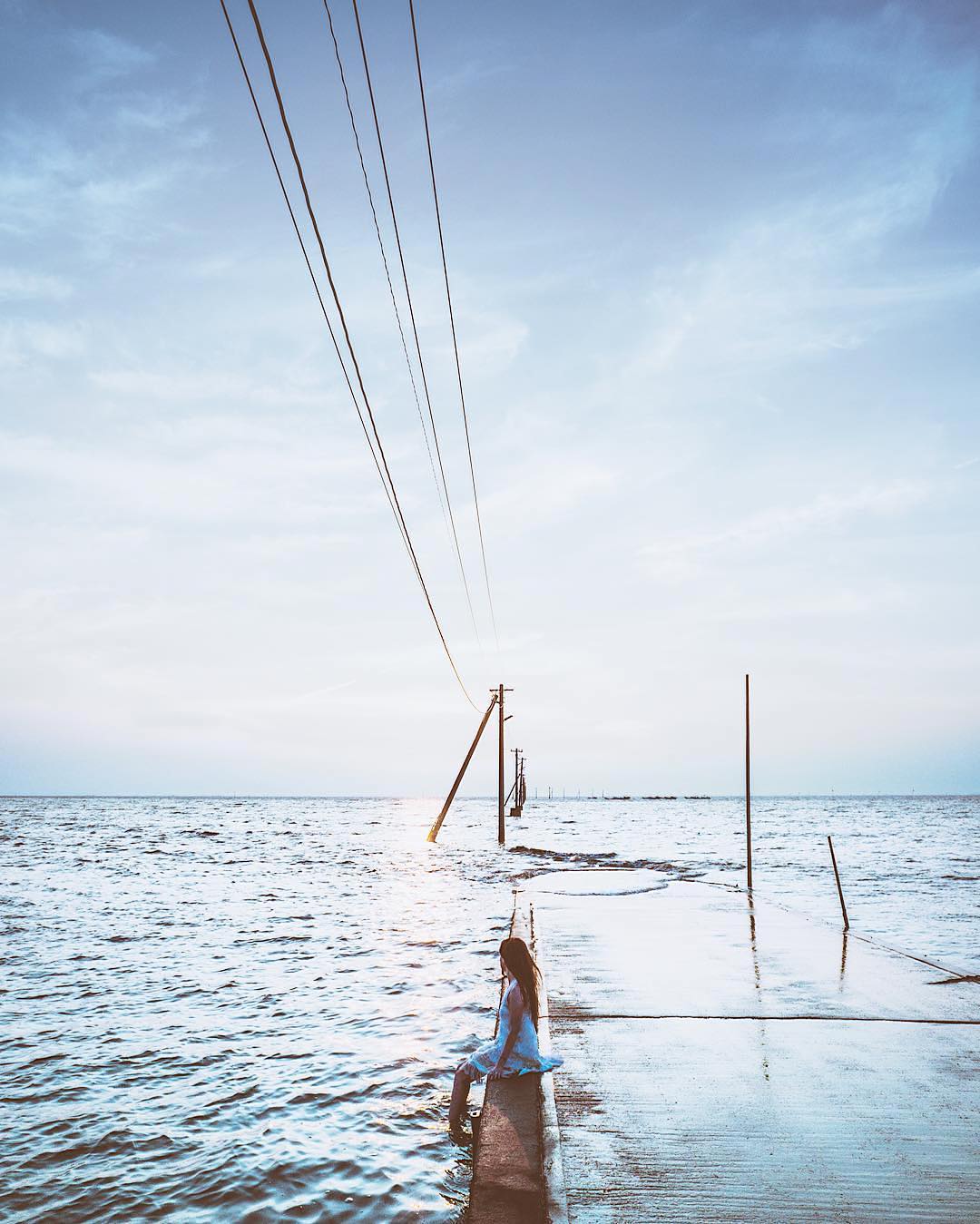 #土曜日の小旅行 — 今週は熊本県宇土市の長部田海床路に小旅行。海岸から沖に向かって伸びるこの道は、遠浅の海に停泊できない船と港とをつなぐ漁業者のための作業通路。満潮時になると道は姿を消し、電柱だけが静かに海を見守ります。みなさんがおすすめするフォトロケーションはどこですか? #土曜日の小旅行 ハッシュタグと位置情報をつけてぜひシェアしてください。