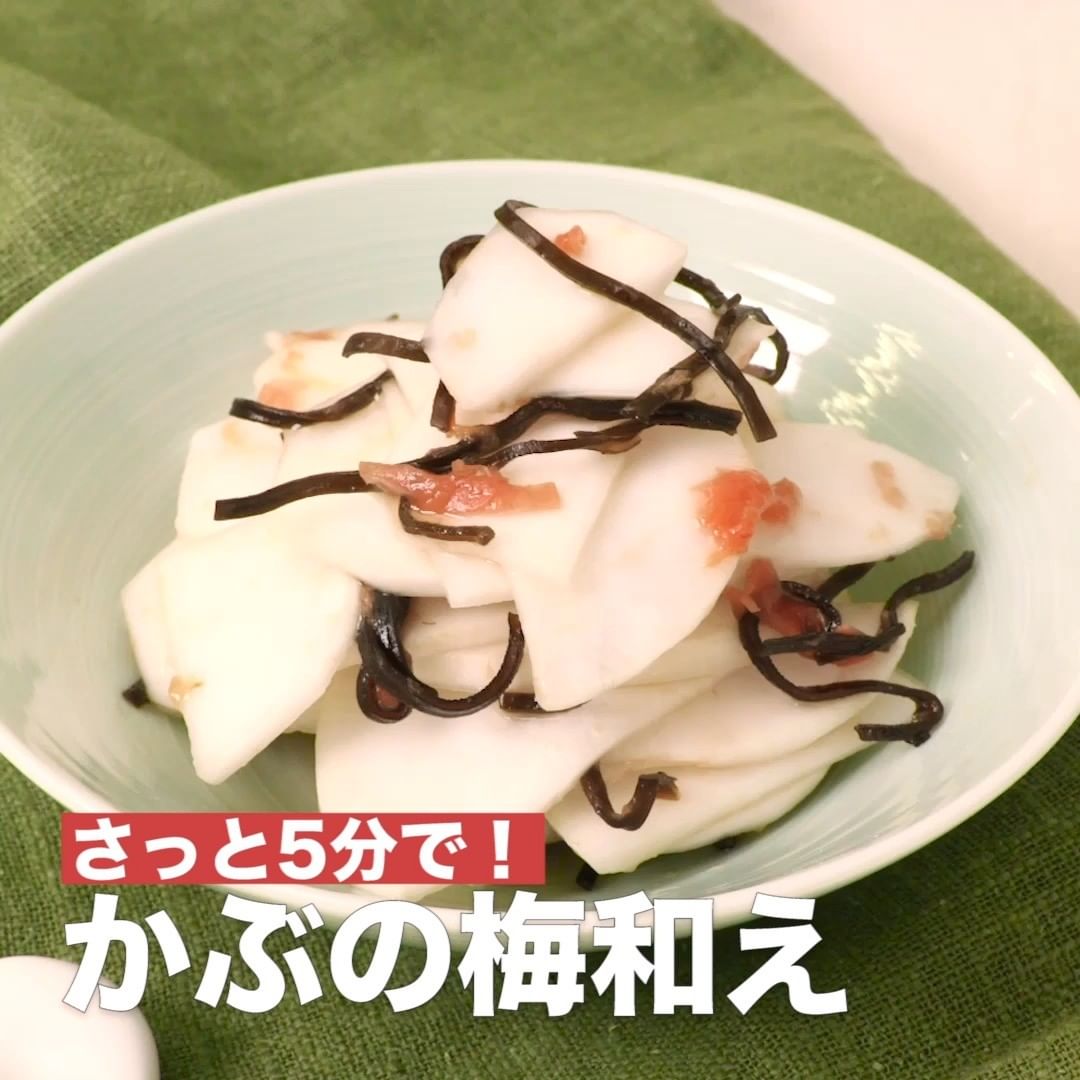 (1)かぶは葉と切り離し、皮をむき半分に切って薄切りにする。梅は種を取り除き、包丁で叩いてペースト状にする