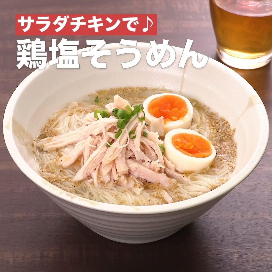 そうめんにひと手間加えたアレンジレシピのご紹介です。よく冷やしたさっぱり塩味のスープに、しっとりジューシーなサラダチキンを添えて召し上がれ♪お好みでラー油やキムチを加えて、ピリ辛にするのもおすすめです!市販のサラダチキンは塩気が含まれるため、スープはあっさり薄味に仕上げています。お好みで水分量や塩加減を調整してお試しください。
