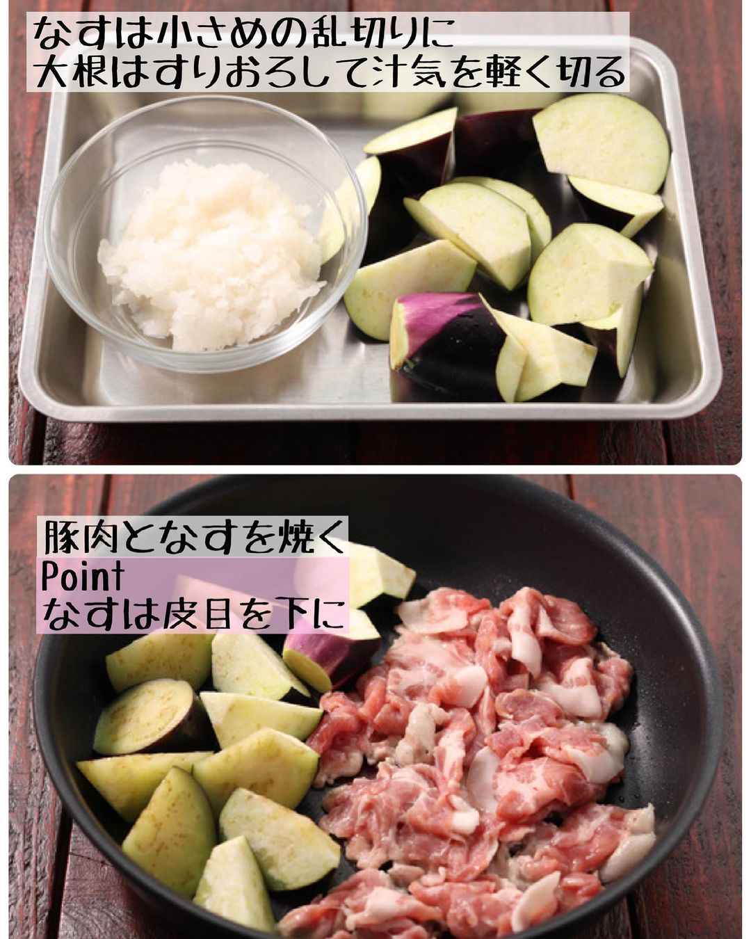 ➊なすは小さめの乱切りにする。大根はすりおろして、軽く汁気をきる。