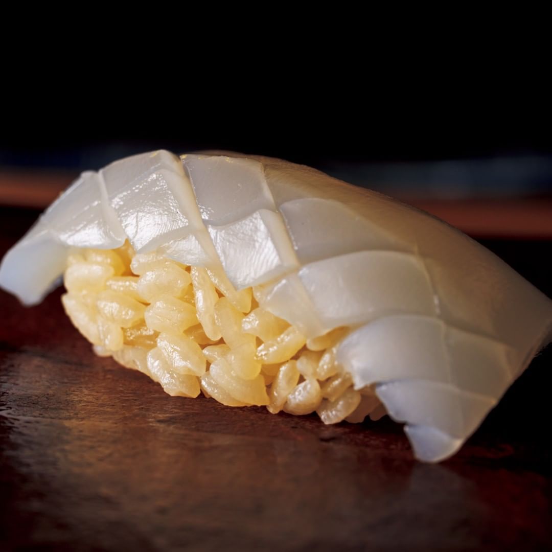 歯切れの良さと甘みが持ち味のいかは、包丁目を入れ食べやすくする一方でイカ本来の旨味も引き立てている