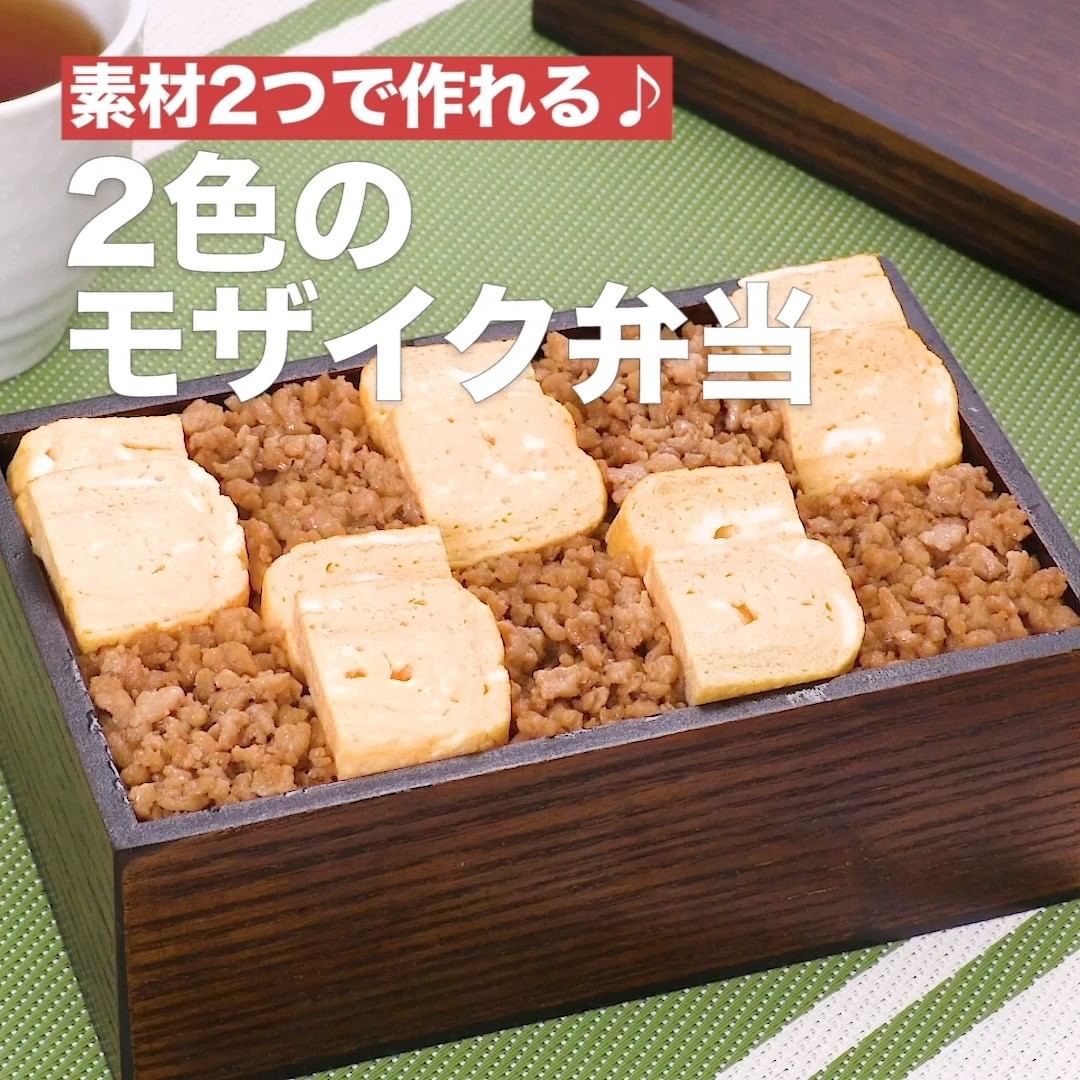 王道な2色丼をモザイクにすることで普段と違った雰囲気に仕上げます♪鶏そぼろは最後にマヨネーズを加えて照りをプラス!甘辛い鶏そぼろのおかげでごはんがすすむ味わいです♪