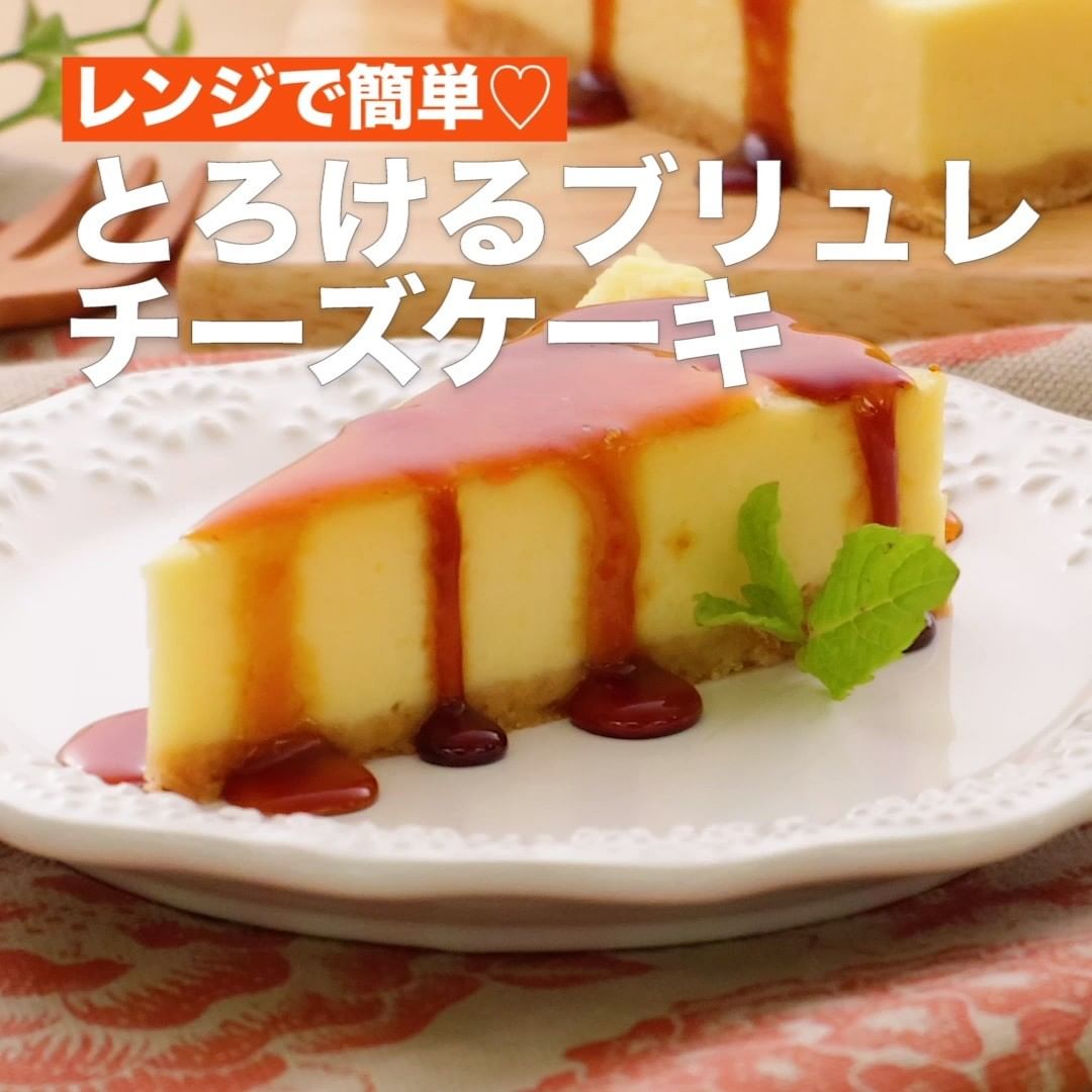混ぜてチンするだけの簡単チーズケーキは、カラメルをかけるだけでまるでお店のケーキのような見た目に!ブリュレをパリンと割ってお楽しみください♡