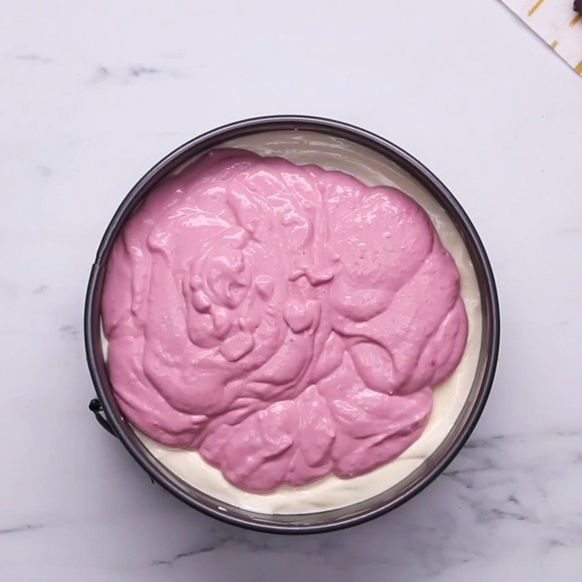 11.最後にラズベリー生地を流し込み、ヘラで平らにする。絞り出し容器に入れた飾りつけ用のラズベリーで水玉模様を作り、つまようじでマーブル状にする。