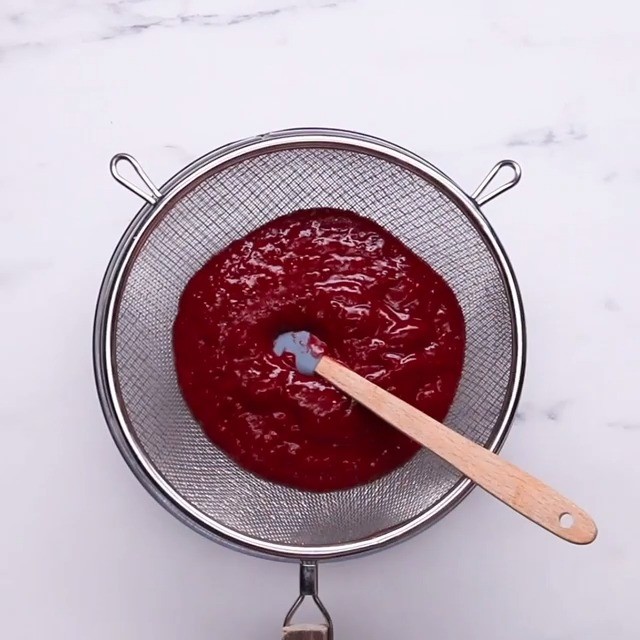 5.解凍したラズベリーをフードプロセッサーにかける。ザルなどでこして種を取り除き、ボウルに入れる。飾りつけ用に40g分を絞り出し容器に移しておく。