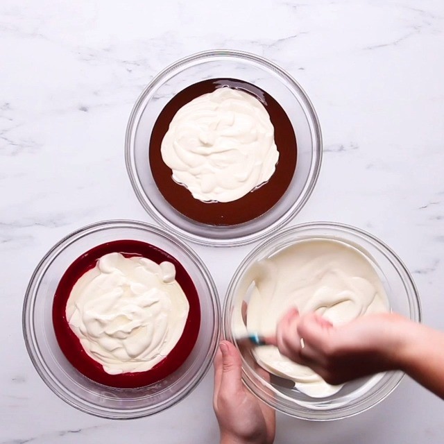 8.(7) の生地を(5)と(6)、新しいボウルに3等分する。(6)以外のボウルに、ココナッツオイル小さじ2ずつを入れ、それぞれ混ぜる。