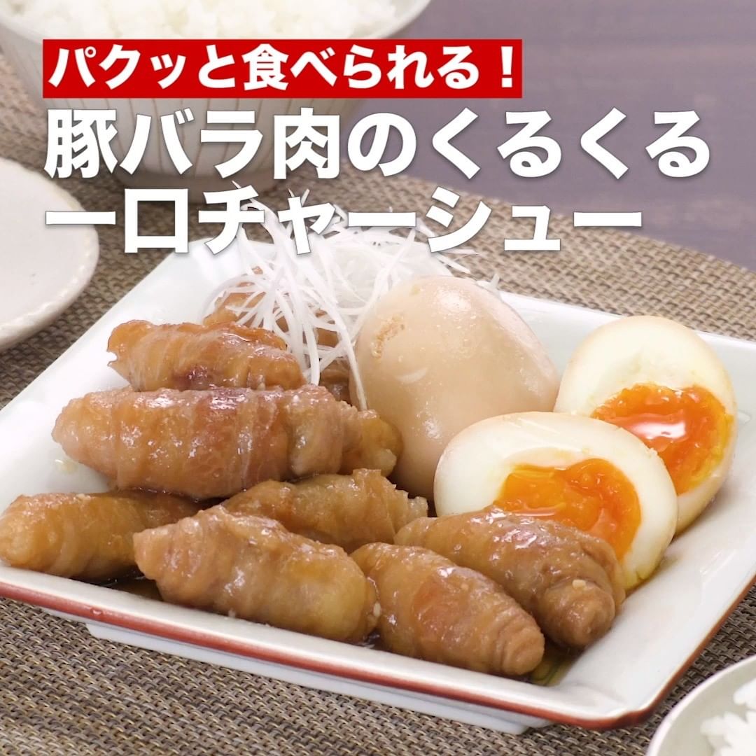 豚バラ薄切り肉をくるくると巻いて、一口サイズのチャーシューを作りました♪短い煮込み時間でも味がしみて、柔らかくジューシーな仕上がりになります!
