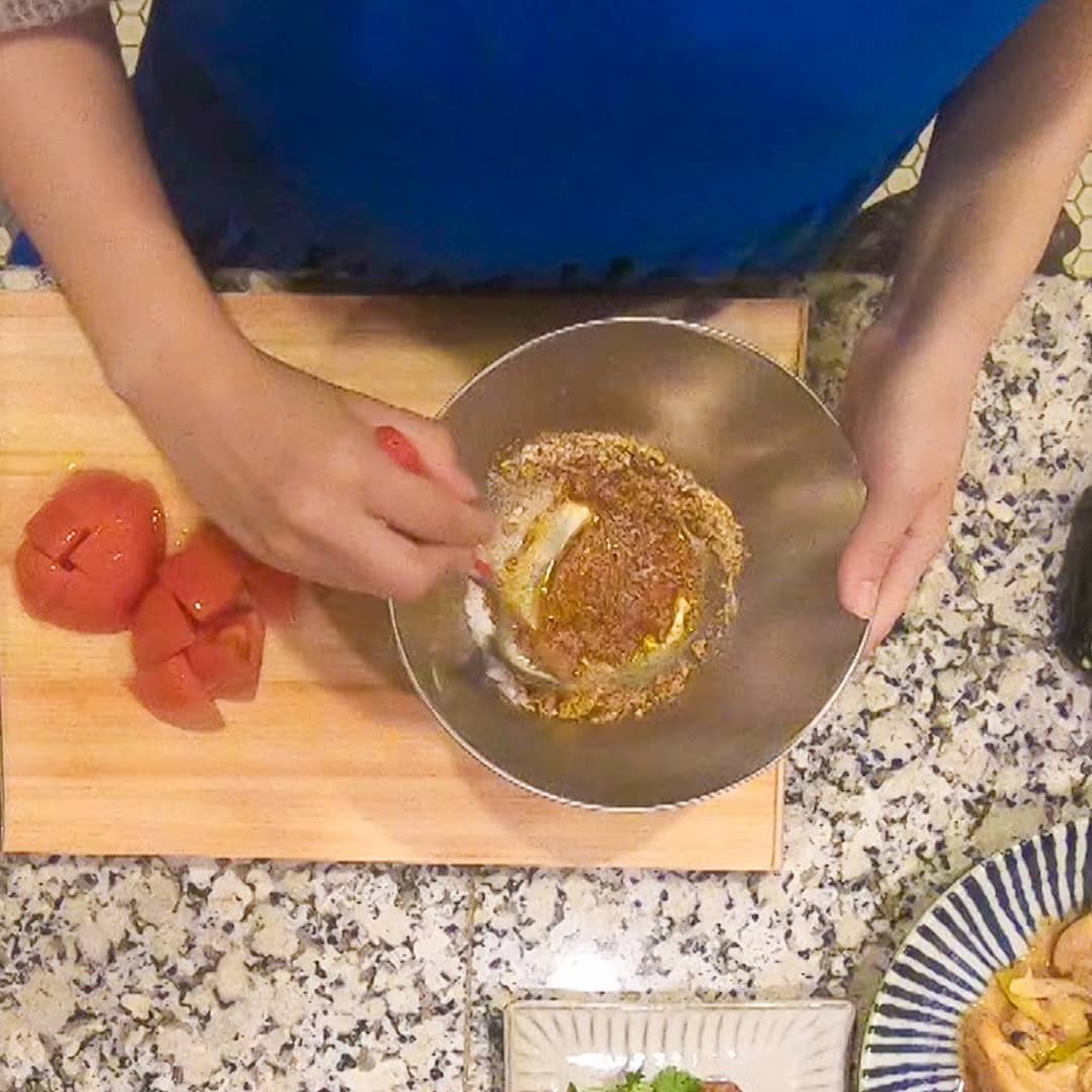 ②ボウルにすり白ごま大さじ3、顆粒和風だしの素小さじ1/2、砂糖大さじ1/2、しょう油大さじ1、塩・ごま油を各少々入れて混ぜ、切ったトマトと和えれば完成!