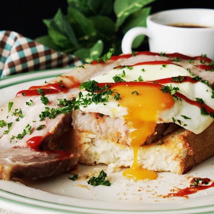 4.食べやすい大きさにカットし、バターを塗った焼いたトーストにのせ目玉焼きと共に盛り付ける