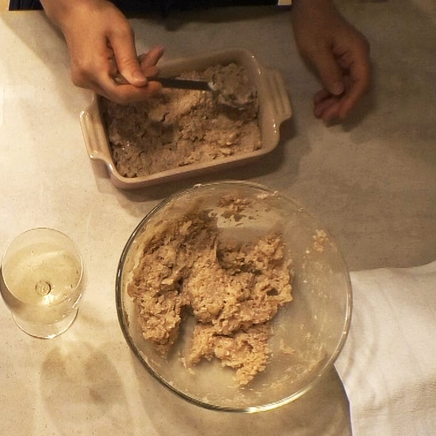 ③耐熱皿に肉だねを平たく敷き詰め、予熱したオーブン240度で15分加熱して完成!