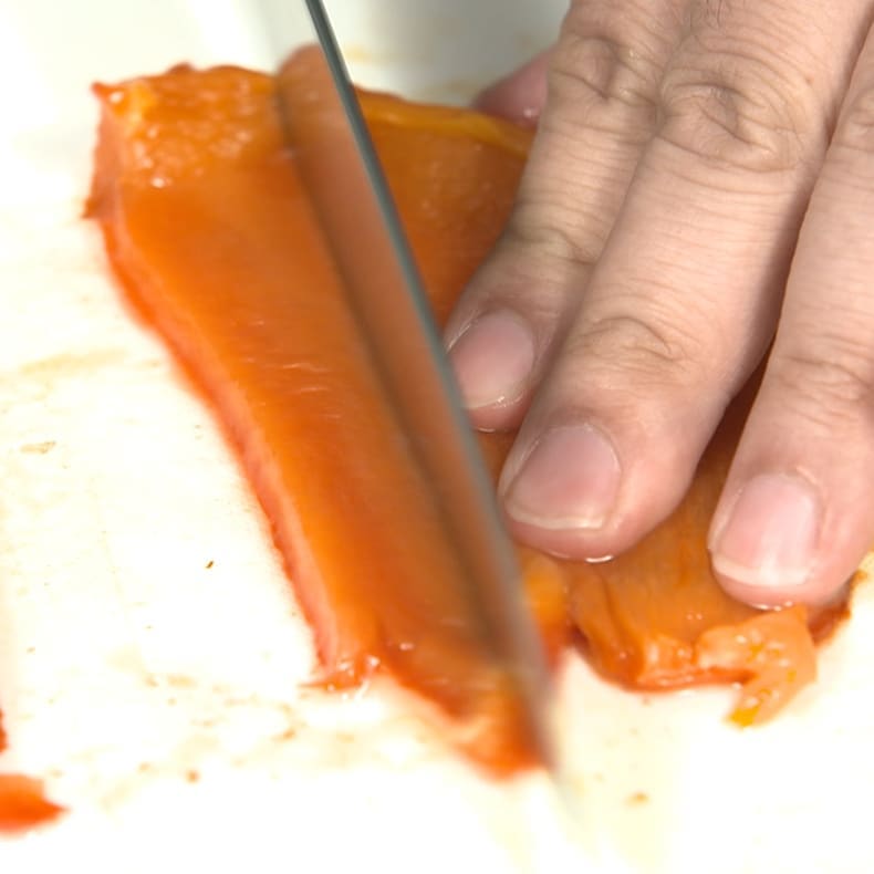④蒸し終わったら焦げた皮をむき、タネを取る