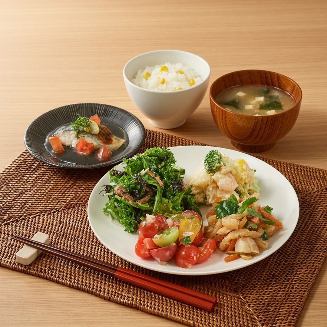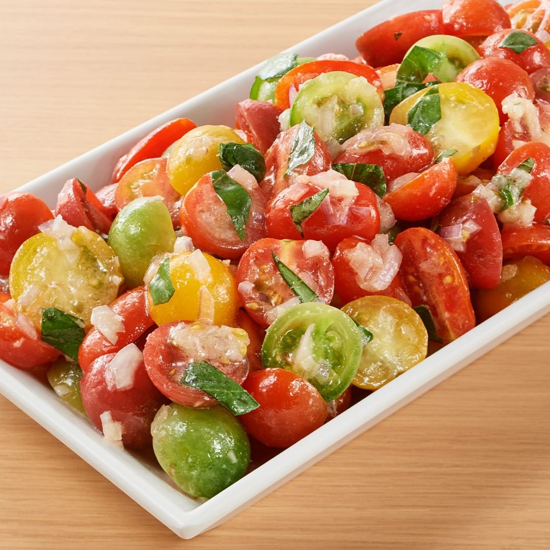 いろいろな種類のトマトを、塩麹とオリーブオイルで和えました。トマト本来の味が楽しめる旬のサラダです。