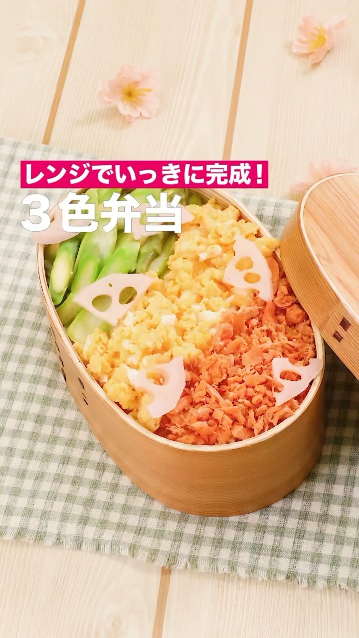 10分でできる春らしい色合いの3色弁当!ふたをあけたら色合いもきれいで可愛い♡レンジでササッと作れてお手軽に作れます♪