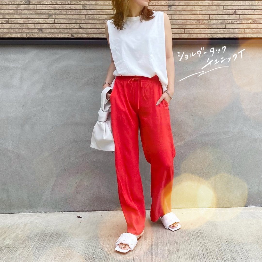 ショルダー部分のタックデザインが、オシャレ見えのノースリーブチュニックT✨サイドにスリットが入っていて、前後丈違いのシルエットだから、タックINするのもGOOD👍リラックスボトムスにも合わせやすくて、とっても素敵に着こなせますね😘