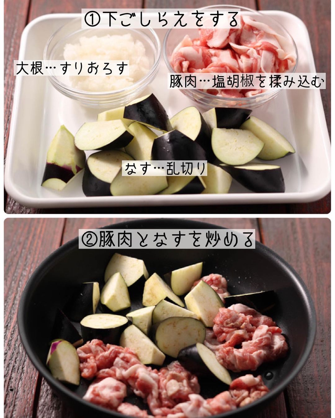 ➊豚肉は塩・こしょうを揉み込む。なすはひと口サイズの乱切りにする。大根はすりおろして軽く汁気をきり、〔𝙰〕と合わせる。