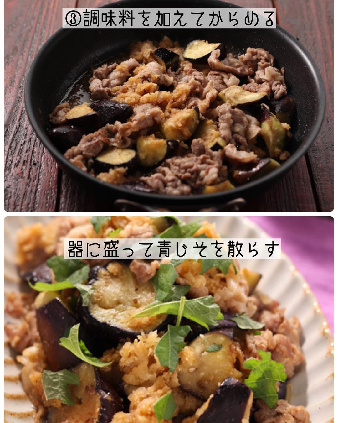 ➋フライパンにサラダ油を中火で熱し、豚肉となすを炒める。全体に火が通ったら、ペーパータオルで余分な油を拭き取り、合わせた〔𝙰〕を加えて絡める。